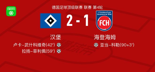 北京时间9月20日德国足球顶级联赛 联赛 第4轮,汉堡主场对阵海登海姆。汉堡卢卡-武什科维奇破门,拉扬-菲利佩破门。海登海姆亚当-科勒破门。最终比分汉堡 2-1 海登海姆。精彩瞬