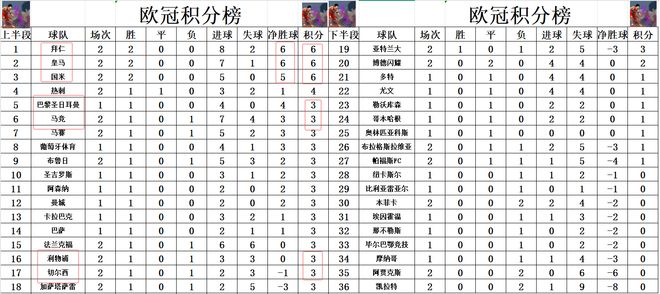 积分榜方面,皇马,国米和拜仁今天都是轻松大胜,都是获得了两连胜,拜仁1个进球优势力压皇马登顶,国米则是差拜仁皇马1个净胜球,排在第3。马竞今天又是一场大胜,他们暂时升至第6,排在卫冕冠军巴黎之后。利物浦今天又输球,遭遇英超欧冠双线连败,跌到第第16,他们身后是取得首胜的切尔西。